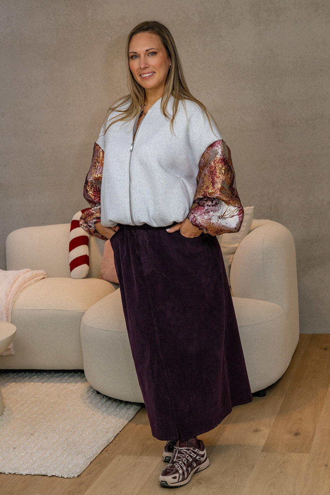 Jul - bomberjas met mouw - lichtgrijs/burgundy tinten